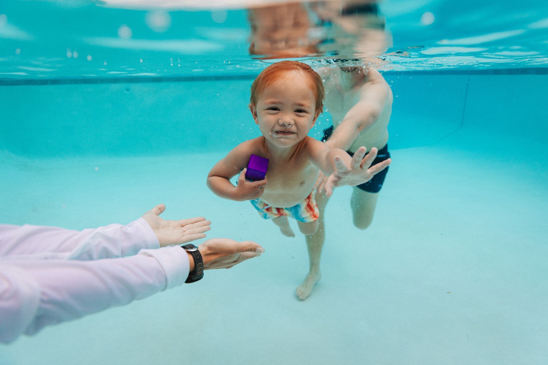 Our first level is for beginners and is primarily focused on learning breath control. Learning how to safely go under water is the foundation and basis of everything else we teach. It's hard to teach students to be safe in the water without being able to control their breath. The primary goal of teaching students in Preschool level 1 is to help them be comfortable in and under the water.